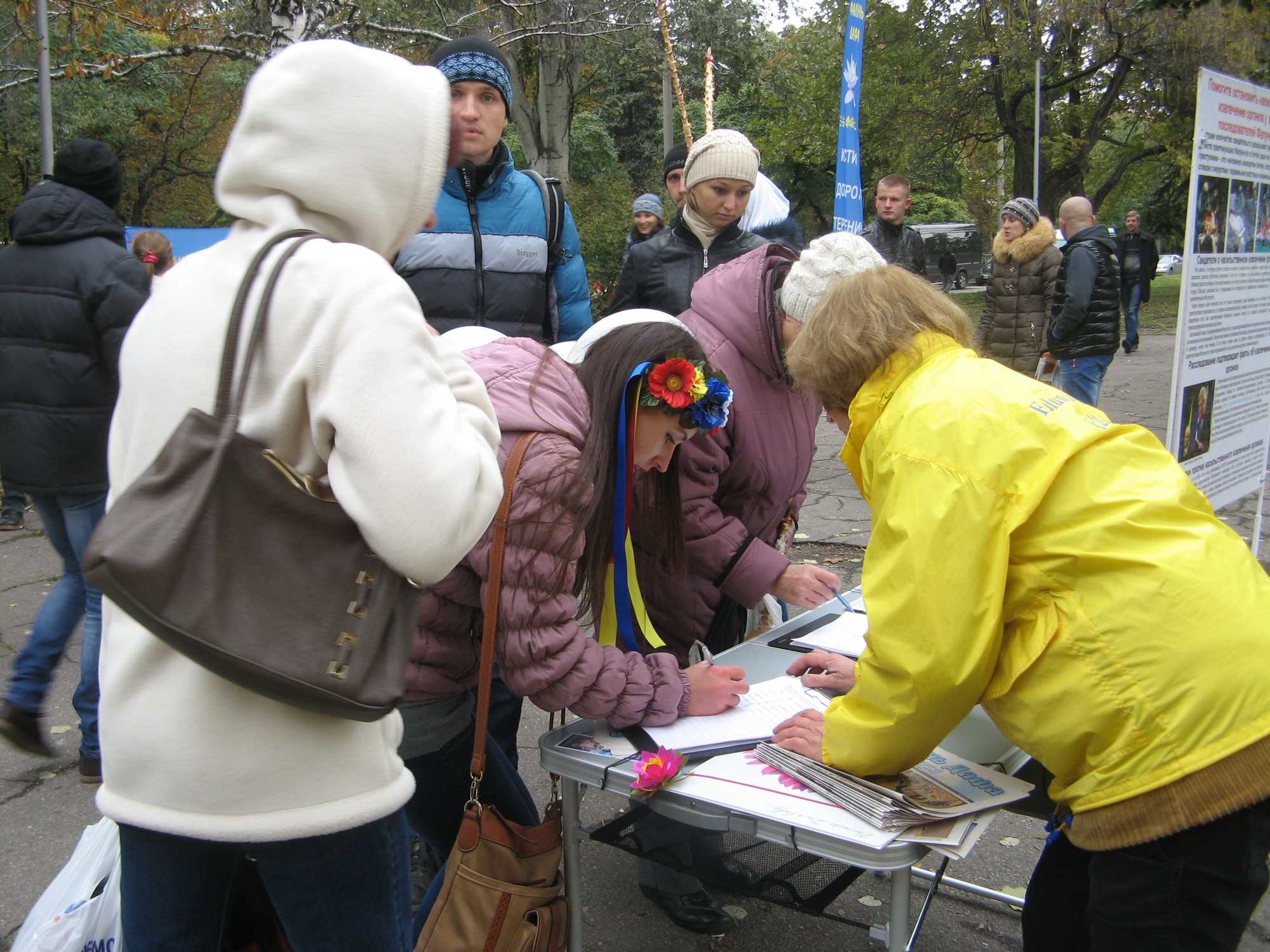 在征签过程中,有个年轻的小伙子听到法轮功学员讲述的发生在中国的迫害后,签下了名字,并对法轮功学员说:“需要立刻停止这一(活摘器官的)罪恶。”