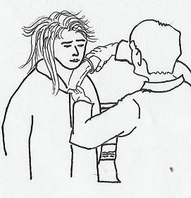马增友又拿出警棍在我头上身上乱打乱捅,甚至动手动脚耍流氓,他企图把手伸到我的上衣里摸我胸,他从我脖领处死拽着我的胸衣带子不放手,我拼命挣扎不让其得逞,累得他没有力气了,他才放弃。后来进来一个警察带我出去了。没多长时间,马增友又把我带回二楼他的屋子里,进行了新一轮更残酷的折磨,还是先打脸,打了一阵子,他用双手做爪状使劲抠住我双眼,邪恶地说:“我把你眼睛挖出来!”又捏住我双耳,来回乱扯,仿佛要扯下来,之后是嘴唇,同样是撕来撕去都出了血,恨不得从脸上拽下来,然后又是打脸……他逞凶时是怕曝光的,时不时看看门窗,怕有人经过发现他的邪恶行径。我明白他的心虚后大喊起来,他害怕极了,马上用擦脚毛巾堵住我的嘴,我吐出来,他就将臭脚往我嘴里伸。如下图示: