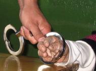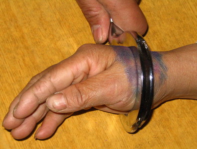 五月二十三日下午一点,恶警、恶人们对张淑坤边审问边用刑,一直折腾到深夜十二时左右。恶警滥施酷刑逼张淑坤招供,逼迫她说出资料来源。当时恶警王建、邸××等人恶狠狠的对张淑坤说:“你们不是说我们是暴政吗?我们就是暴政,我们就要暴政!”他们先把张淑坤的手指攥紧用手铐铐住,然后用力抓住手铐往桌子上摔,使手铐越缩越紧(演示图一),卡住指骨后一边抖动张淑坤的手,一边扭转她的手腕,恶警们还嘲讽的说:“手腕挺软的”,当时张淑坤的手就成了青紫色(演示图二)。(文中照片为根据当事人描述而重组的当时迫害的情景。)