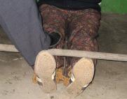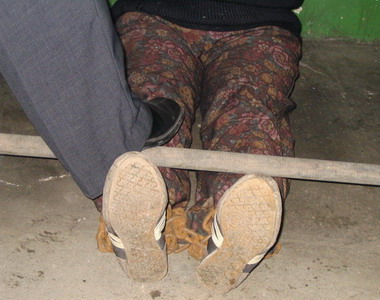 接着恶警们逼迫张淑坤坐在地上,双腿用铁铐子铐住,然后找来一个拖布把,横放在张淑坤小腿上,先是一恶警一只脚上去猛踩张淑坤。他们见张淑坤不说资料来源,两个恶警一人一只脚上去同时猛踩横放在张淑坤小腿上的拖布把,这还不算完,两个恶警的脚还同时来回搓拖布把,疼的张淑坤浑身颤抖……(演示图八)