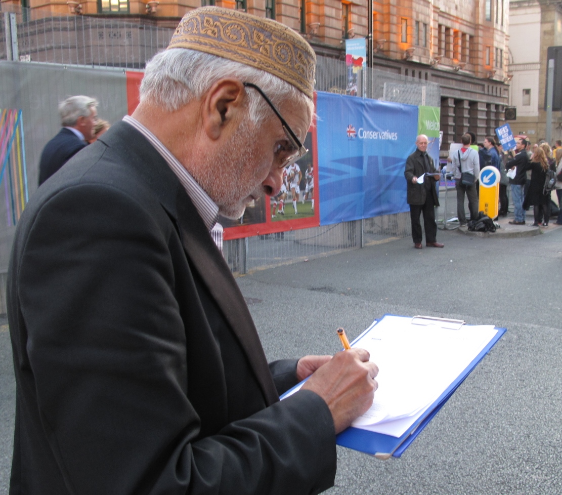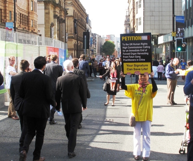 ![]() 图1-2:九月二十九日,法轮功学员在曼城英国保守党二零一三年年会会场外讲真相、及反迫害征签活动。 |