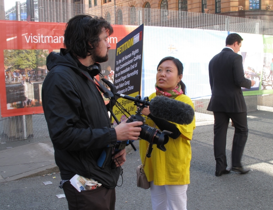 ![]() 图3:九月二十九日,法轮功学员正在向媒体人士讲真相。 |