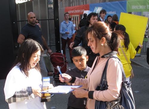 九月二十二日,一名女孩先是接过传单后没有签名就走过去了,可是不多会她又回来了,表示自己明白了真相,要签名支持法轮功学员反迫害、反活摘;签名离开后,不久她又带着自己的妹妹回来签了名。当天会议结束的时候,两位女孩又带着她们的母亲来签名,而这位母亲是位活跃的政治家。