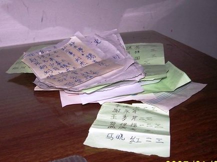大陆某地几位六、七十岁的老年法轮功学员每天都出去讲真相救人,从不曾间断。这张图片表现的就是:连日来几位老人救人名单的汇集,一二三代表退出邪*党-的党团队;二三代表退出邪*党-的团队;三代表退出邪*党-的少先队。图中的名单基本上都是真名实姓。