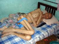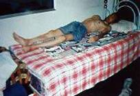 一天,恶警张某指使犯人先给史治敏戴上背铐,插上管子灌食,然后插着管子把他绑在死人床上,脸朝上成大字型,两手两脚铐四个铐子一动不能动,稍一动便疼痛不堪。昼夜不能睡觉,稍一瞌睡随时就会窒息死亡。绑死人床四天四夜后停了二天,又重复戴背铐灌食,再插上胶皮管子不拔铐在死人床上又是四天四夜。在死人床上一天灌食三、四次,而且灌的量很大,是原来的二至三倍。刚灌一、二次人就受不了,胃胀疼的难忍。再灌三、四次,肚子鼓的象快爆炸一样。一个五十多岁的张姓警察恶狠狠地说:“我一天灌你四次看你吃不吃?这回我灌你十天。”到第四天恶人们发现史志敏肚子鼓的很大,里面有一大硬块,而且非常硬,医生一看头上、身上有十多处已经腐烂的褥疮,最严重的是尾骨烂一个坑,流着脓水露着骨头,两腿、两脚肿得很大,浑身发黑、严重脱像,已不象人样。当时史治敏瘦骨嶙峋,体重仅剩下了四十几斤,耳朵也聋了,眼睛也看不见了,神志不清经常昏迷,几乎不能说话了,命在旦夕。恶警也认为活不了几天了,才把插的管子拔下来。后送孟州市医院抢救,光导尿就导出四大盆。四、五天后恶警们又把奄奄一息的他拉回孟州看守所。