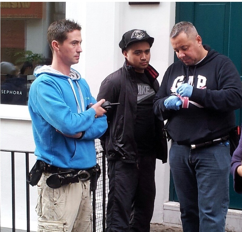 ![]() 图2:攻击伦敦唐人街法轮功真相点的暴徒阿里•亚历克斯•奥尔蒂斯(中间着黑衣者)被接获报警赶来的便衣警察带上手铐当场逮捕。 |