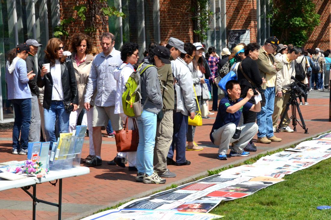 游人一批批的走过,很长时间过去了,小伙子还在那里认真地读特刊。严女士又拿了《惜缘》等法轮功真相资料过去给他并对他说:“回国后一定要带给你的亲朋好友看,让他们三:退.,三:退.保平安。救人一命、胜造七级浮屠。”小伙子接过资料,连连点头表示感谢。