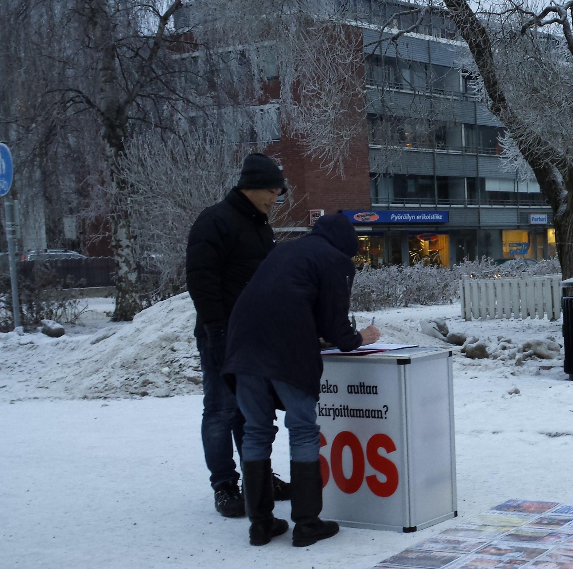 路过的行人走得非常快,因为寒冷的关系路上行人也特别地少,但是看到大大的横幅后,路过的人都会过来接真相传单,了解真相后纷纷签下自己的名字。