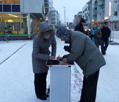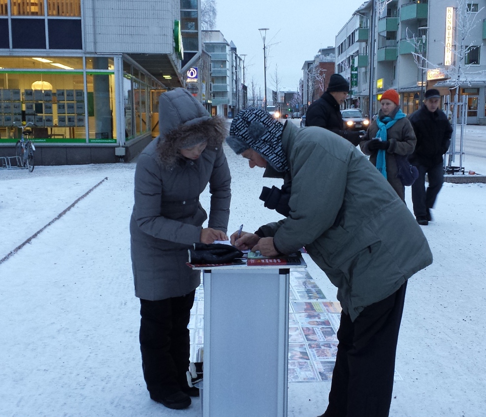还有一个女士签完名字对法轮功学员表示,这么冷的天还出来向民众讲真相她很感动,她会告诉更多人法轮功的真相。
