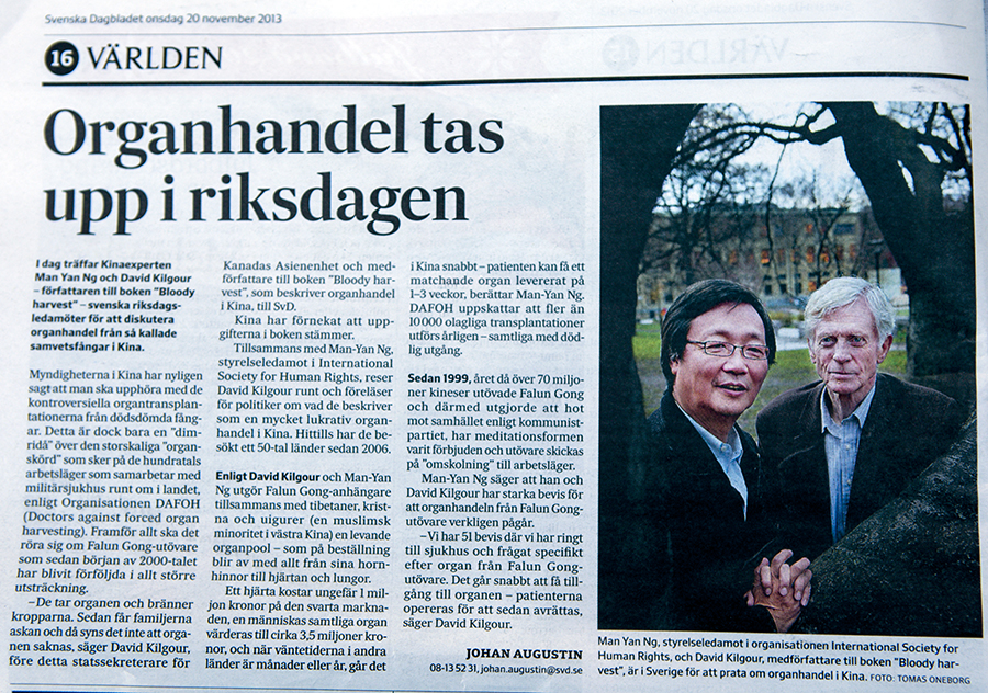 议会召开研讨会的当天,《瑞典日报》用半版的篇幅发表了题为“在瑞典议会研讨中国的器官贩卖”一文。报导了中国问题专家吴曼杨和《血腥的活摘器官》一书的作者之一大卫•乔高造访瑞典议会并讨论中国如何从所谓的良心犯身上强摘器官的问题。