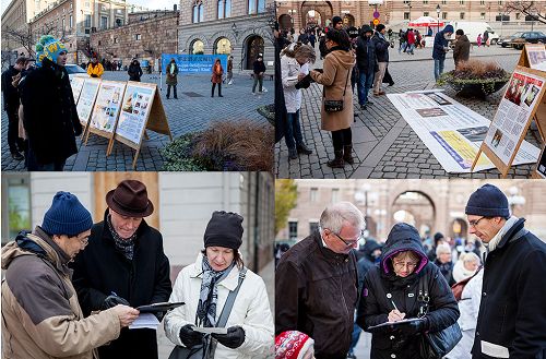 十一月二十三日上午,瑞典法轮功学员在首都斯德哥尔摩最热闹的皇宫旁的钱币广场(Mynttorget)向过往的行人继续征集“立即停止在中国发生的强制活摘法轮功学员器官”的签名。