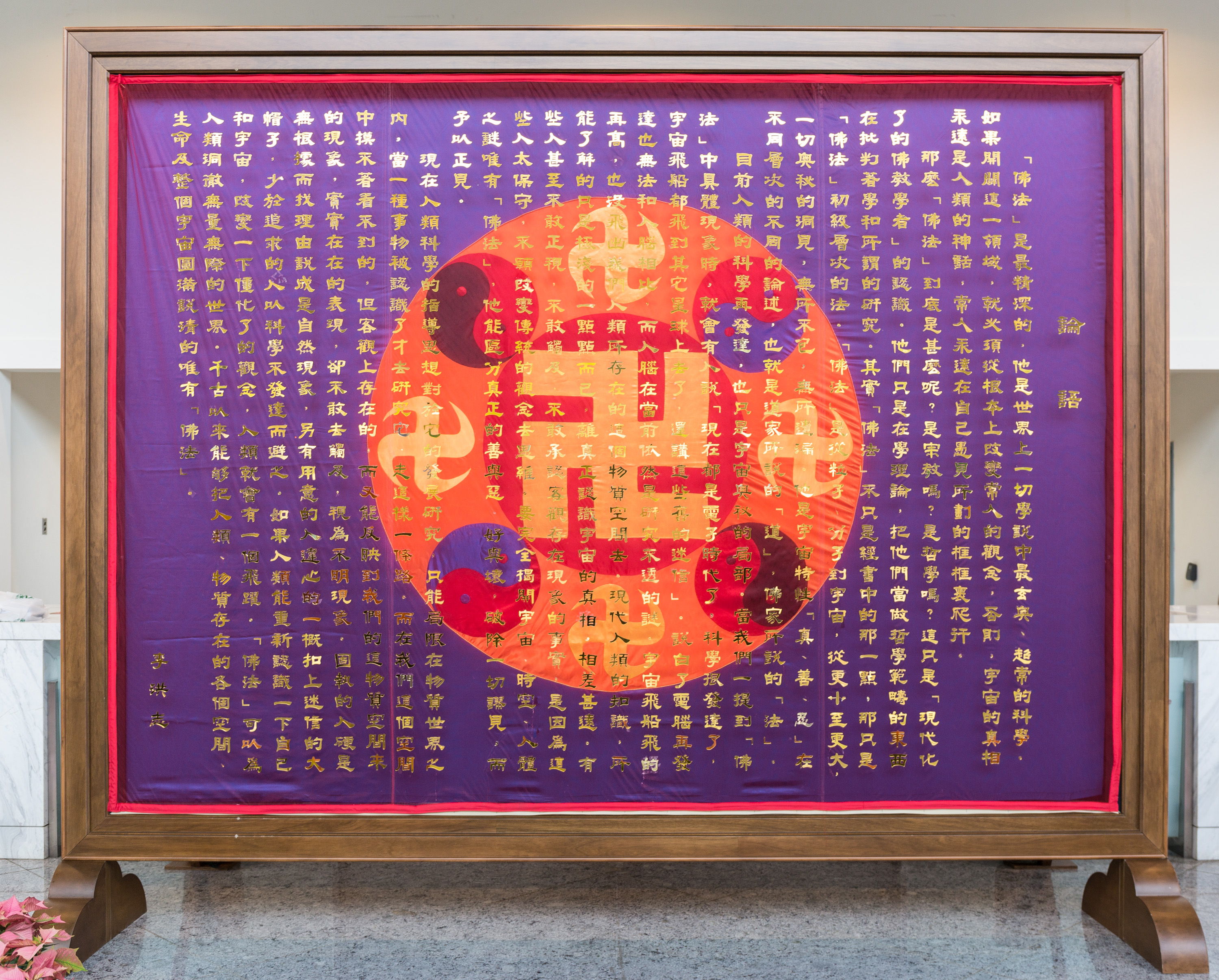 ![]() 会场前厅摆放巨幅烫金的《论语》 |