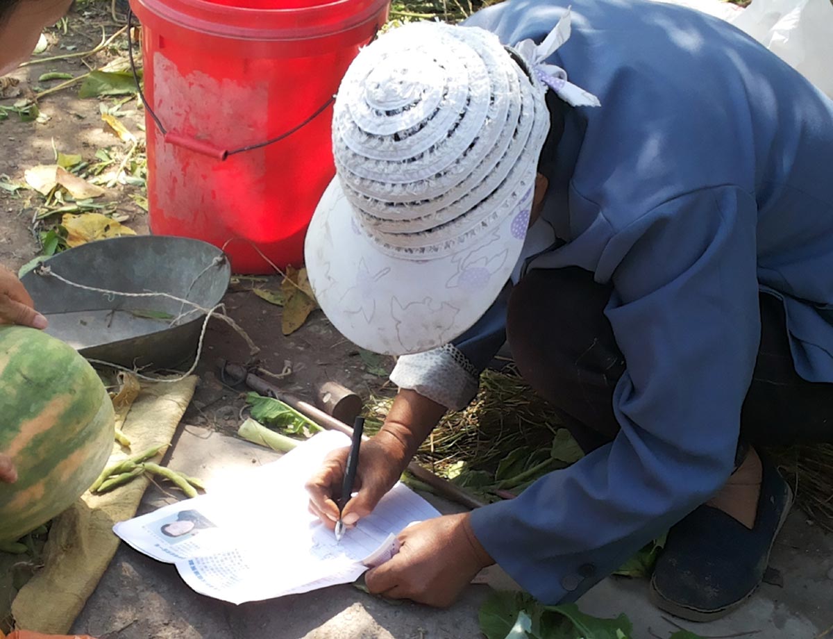![]() 路边的菜农听了法轮功学员的讲述,很吃惊也很同情,说:“生命宝贵呀,赶紧让他出来吧。”这位菜农认真的在征签书上签上自己的名字。 |