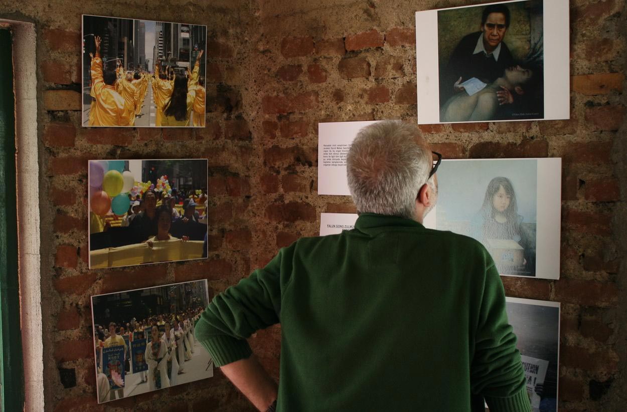 ![]() 土耳其迪亚巴克市的玛雅咖啡屋展厅里,参观者聚精会神地观赏每一幅法轮功真相图片 |