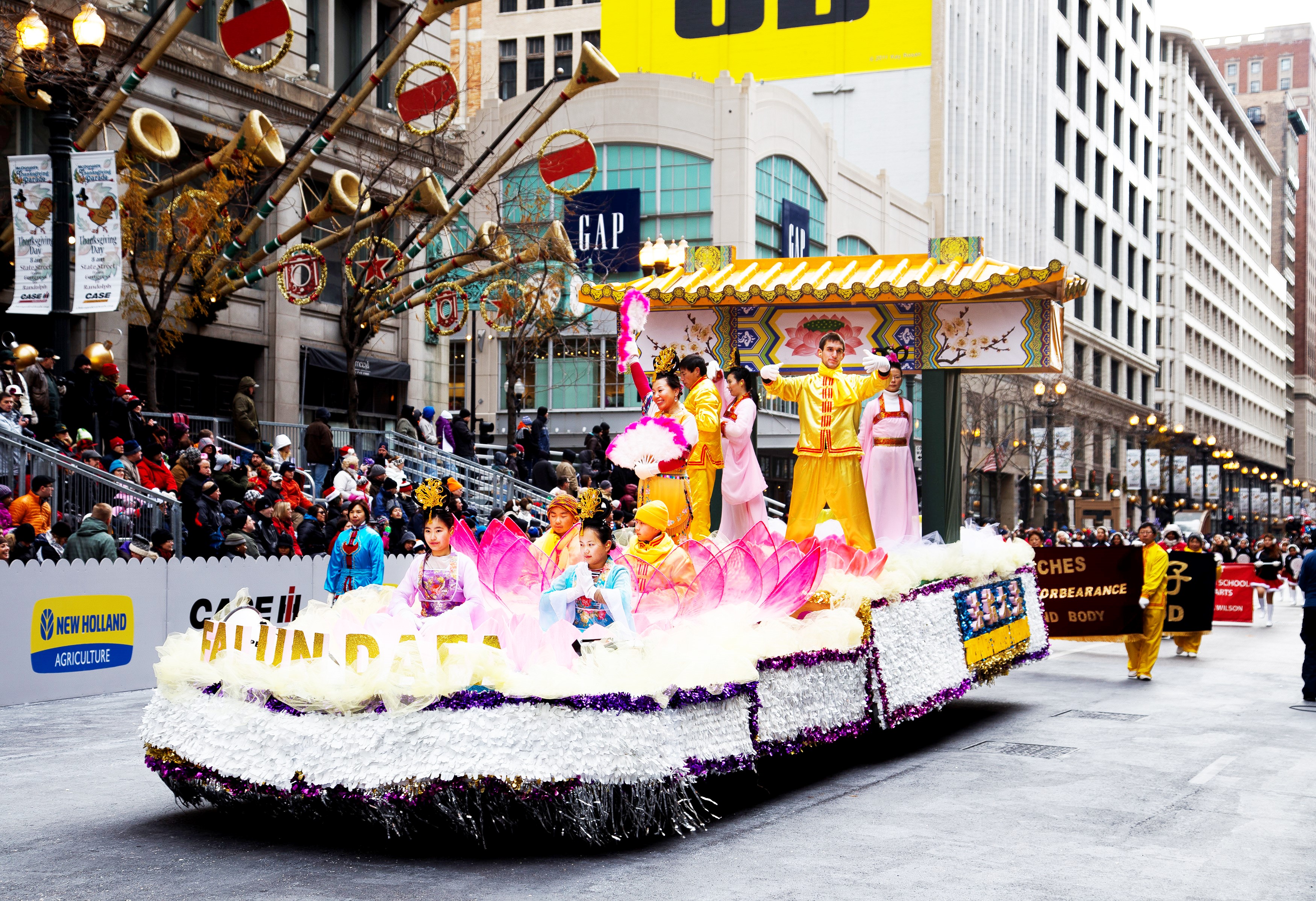 ![]() 图二:芝加哥感恩节遊行中法轮大法功法演示花车。 |