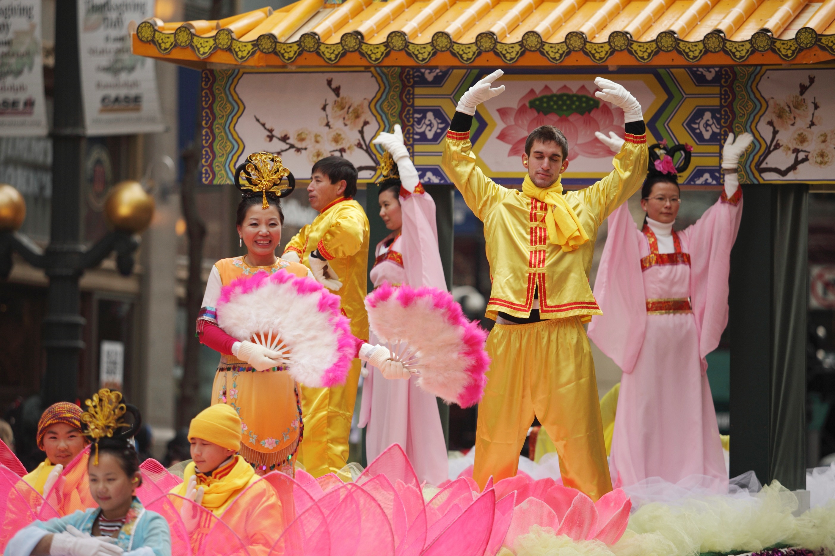 据悉,年年参加感恩节遊行,花车造型设计就不能一成不变,要以给人清新的感觉。这对于法轮功学员来说也是一个挑战。如何展现修炼境界之美好,同时突出大法根植在中华悠久的历史文化中,成为参与花车设计的学员们思考的课题。今年,花车上的荷花、彩云间,一个飞檐斗拱、古色古香的牌楼格外引人注目。法轮功花车经过之处,人群中不时发出赞叹:“Beautiful!”(太美了!)也有大陆来的中国人说:“不可思议!”他们告诉记者,在香港、台湾,法轮功处处可见,没想到,这个感恩节遊行也看到了他们。