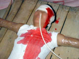 二十四日上午,这一伙恶人打手又来了,里玉书仍不配合,她们将里玉书从床上毒打到地上。杨秋香狠打里玉书的耳光,用脚拼命的踩里玉书的小腿。李丹、王鑫华、邢国辉又用胶带缠捆里玉书。