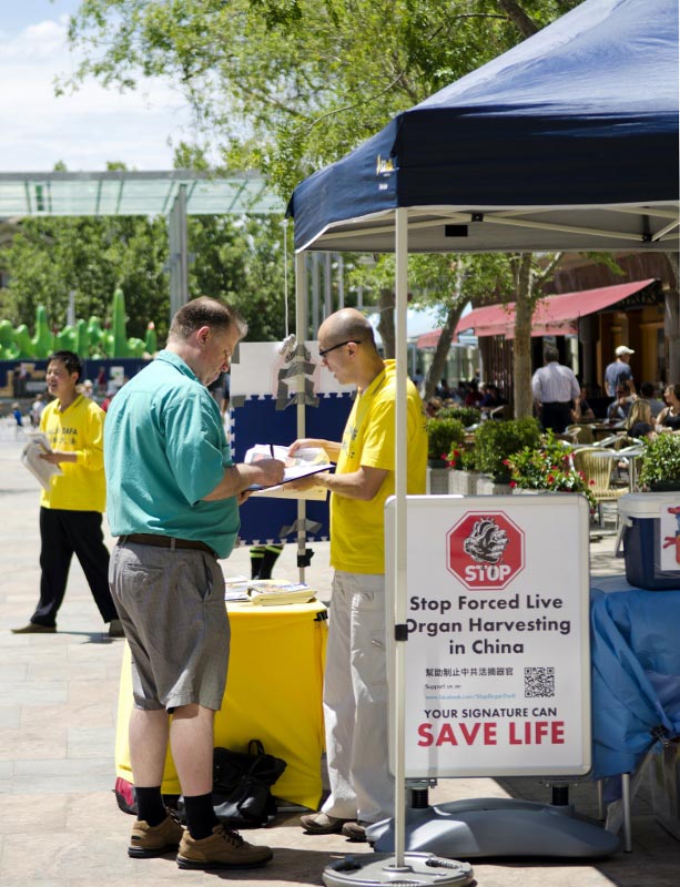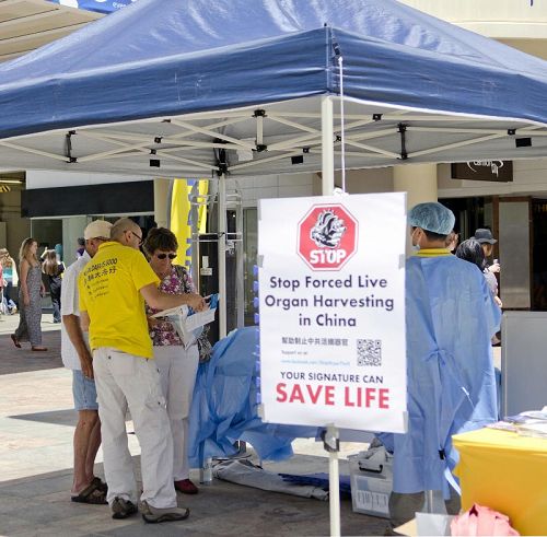 相当多的公众已经从澳洲当地媒体,及国际媒体的新闻得知活摘器官的事情在中国发生,或从同事朋友处有所耳闻,但他们表示在市中心看到演示的场景还是感到触目惊心。Denise说她在南美的一位朋友曾经跟她讲过这件事情,“但路过这里看到你们的演示,和‘停止中国的活摘器官(Stop forced live organ harvesting in China),你的签名能够挽救生命(Your signature can save life)’的展板,内心还是感到冲击。”她向在场的法轮功学员了解更多详情之后,在征签表上签了名。