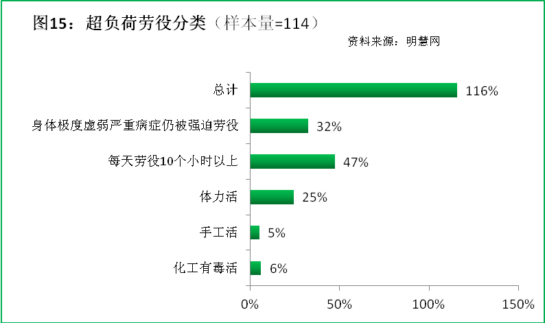 在221位被超负荷劳役迫害法轮功学员中,我们统计到114例文献有记录中共所使用的劳役手段,结果如下:
