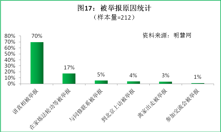 1999年720以来,中共利用其掌握的宣传机器,对法轮功及创始人李大师进行了全面毁谤和诬蔑,蒙蔽了许多群众,甚至煽动民众仇恨法轮功学员,参与到迫害之中,使得大陆法轮功学员时刻处于被全民迫害的险境。本报告调查的3653个样本中,我们统计到212个样本(占总体的6%)在最后一次致死迫害中因为被举报而遭受中共绑架迫害,其中因为讲真相被举报比例最高,达70%,然后是在家炼法轮功等被举报(17%),与同修联系被举报(5%),具体如下(图17):