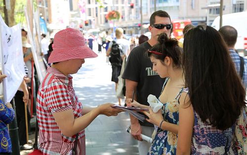 当天在悉尼市政厅广场前乔治街看到和听到了真相的悉尼民众,纷纷在反对和制止活摘器官征签表上签了名,表示支持。