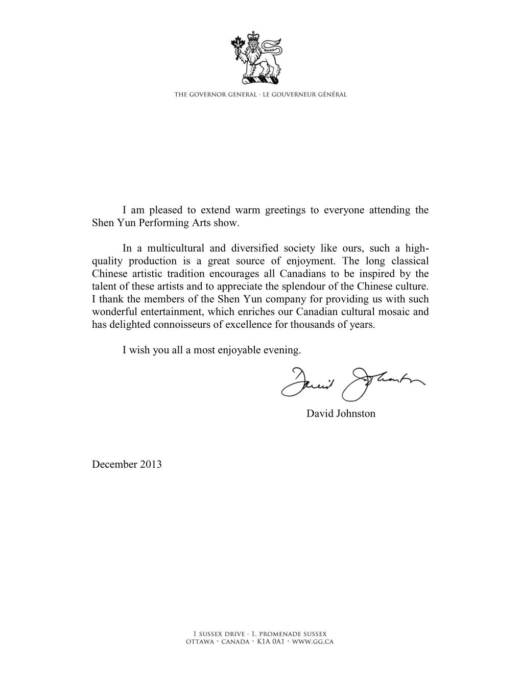 总督并在贺信中写道:“源远流长的传统中华艺术传统,让所有的加拿大人接受着(神韵)艺术家的才华的启迪,并欣赏到中华文化的壮观绚丽。我要感谢神韵艺术团成员为我们提供了如此精彩绝妙的演出,(神韵)让我们加拿大的文化大为增色。”