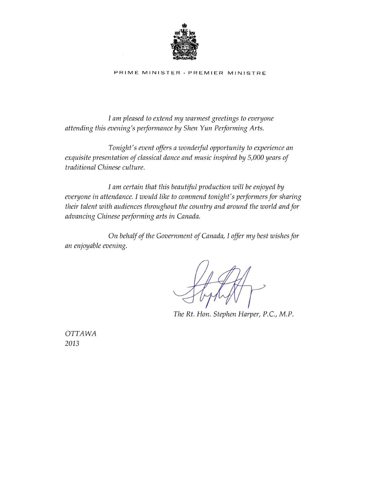 哈珀总理在贺信中说:“我非常高兴能向今晚观赏神韵演出的每一位观众致以最热情的问候。今晚的(神韵)演出提供了一个体验蕴含五千年中华传统文化底蕴的中国古典舞和音乐的绝佳机会。”