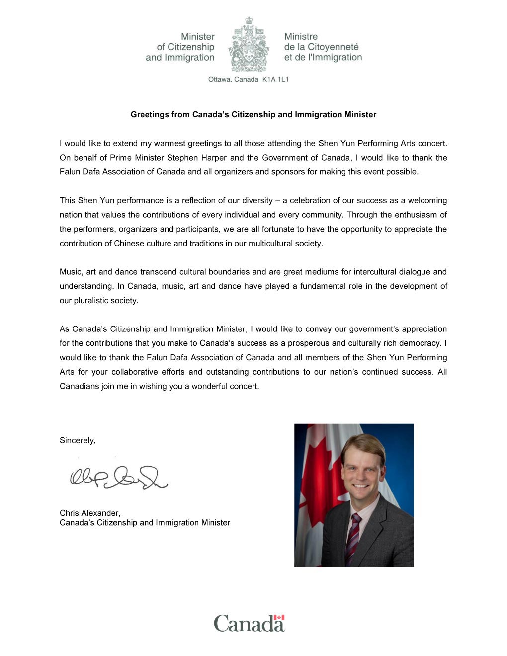 新晋联邦公民及移民部长克里斯·亚历山大(Chris Alexander)在给神韵演出发出的贺信中说:“我要向加拿大法轮大法学会和所有神韵艺术团成员表达感谢,谢谢你们为我们国家的不断成功作出的努力和突出贡献。”(移民部图片)