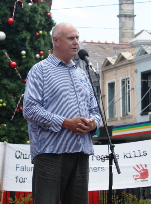![]() 法轮功团体的发言人约翰·戴乐在集会上谴责中共迫害法轮功 |