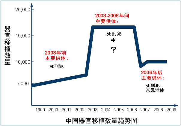 根据中国医疗器官移植协会数据,中国在94—99年,约有18500个器官移植。而在 2000—2005 年,进行了60000例移植。这猛增的41500个移植器官,供体源自何处?中共称这些器官来自死刑犯。据大赦国际纪录,2000-2005 年间,中国大陆平均每年处决死刑犯1616人。而死囚器官利用率也不过30%。据中国器官移植网提供的统计,2006年仅有22位死者家属同意捐出亲人的器官。可见,把大陆“死刑犯器官”和“捐献器官”数量加起来,也相差甚远。在世界上器官移植中,人要等器官,普遍需用时间要一两年,而在中国只需两周甚至一周,几乎是器官等人,这就意味着有一个庞大的活体器官供体人群的存在。