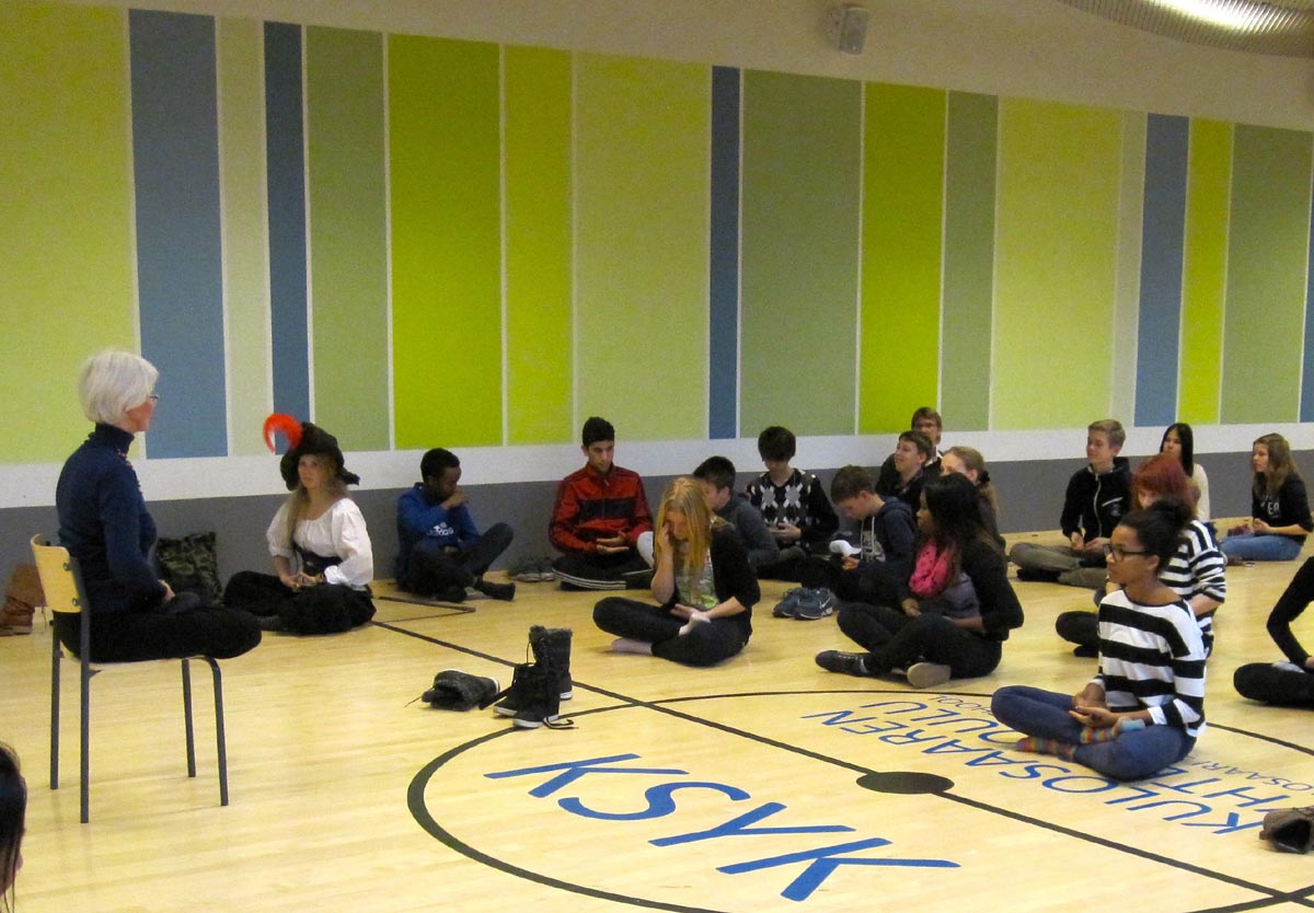 当年轻活泼的学生们走入学校的体育馆,很快他们就安静下来并开始聆听西人学员SINIKKA女士讲述,法轮功是按照真善忍指导学员修炼,并详述其对修炼人身心的受益、提高修炼人的道德修养等好处,人们可以自由和免费得到教功。 当学生听到开始学炼五套功法时,他们都迅速站立并按照西人学员的安排站好,开始认真地学起每套动作。之后,多位学生感兴趣的提出很多关于法轮功的问题,SINIKKA 女士都耐心的一一给予解答。此时看到孩子们在大法的沐浴下流露出愉悦的、欢快的表情。