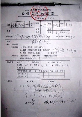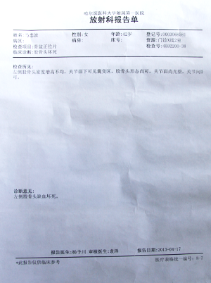 二零一二年我又一次去了哈尔滨北方股骨头坏死研究所取片,那位所长又给我拍了个片子,结果仍然是股骨头坏死的症状。