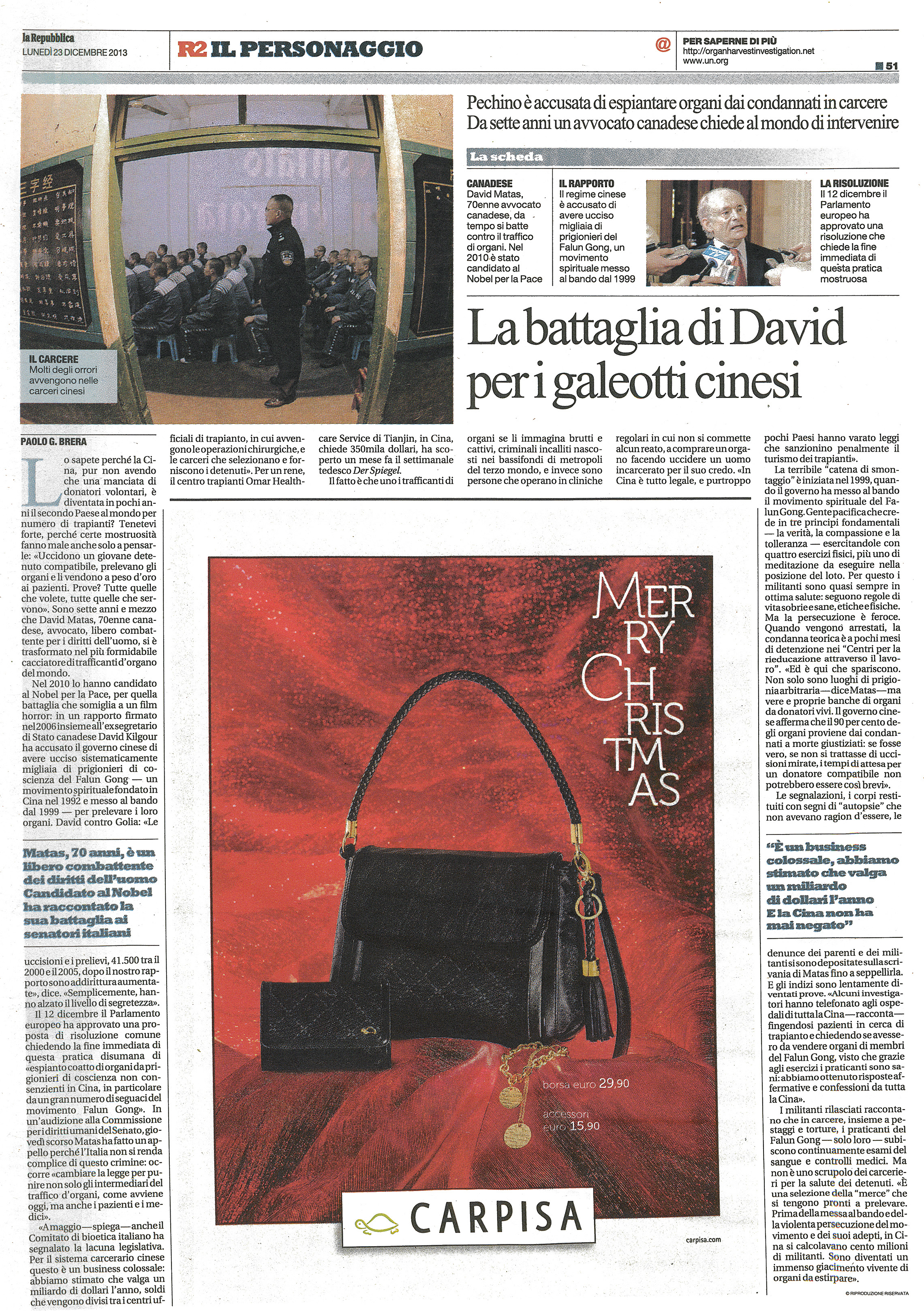 ![]() 图:意大利共和国报的报导“为了中国良心犯而战的大卫” |