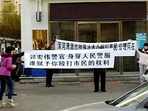 ![]() 图:法轮功学员李方芳和朱兰英的家人在派出所门外打出条幅谴责警察打人 |