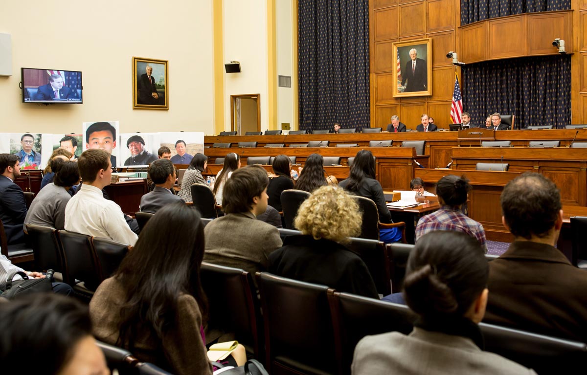![]() 二零一三年十二月五日,法轮功学员王治文之女王晓丹等五位年轻女士在题为“让我们的父亲获得自由”的美国国会听证会上作证,呼吁立即释放被中共当局非法监禁迫害的父亲。 |