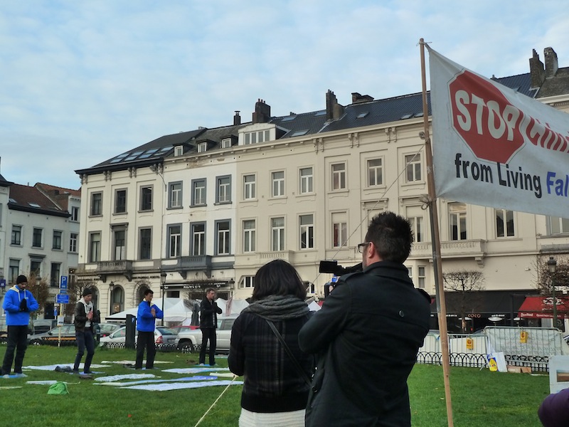 ![]() 在欧洲议会大楼外炼功弘法的法轮功学员们 |