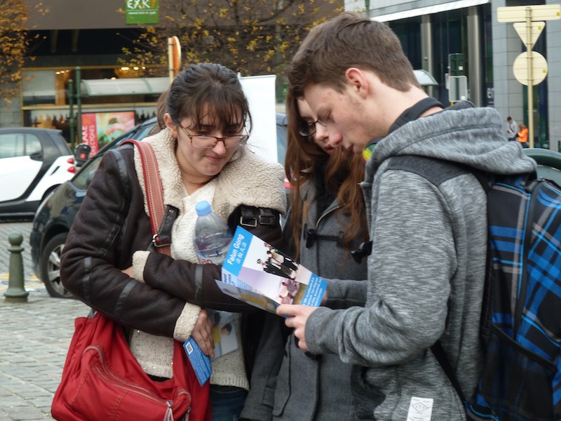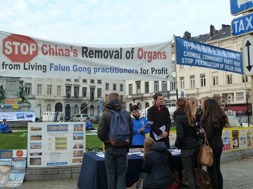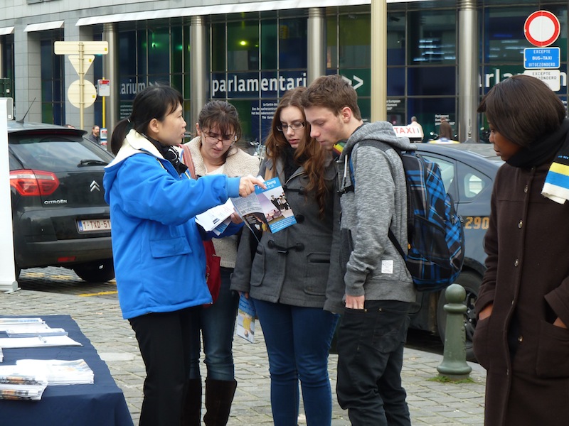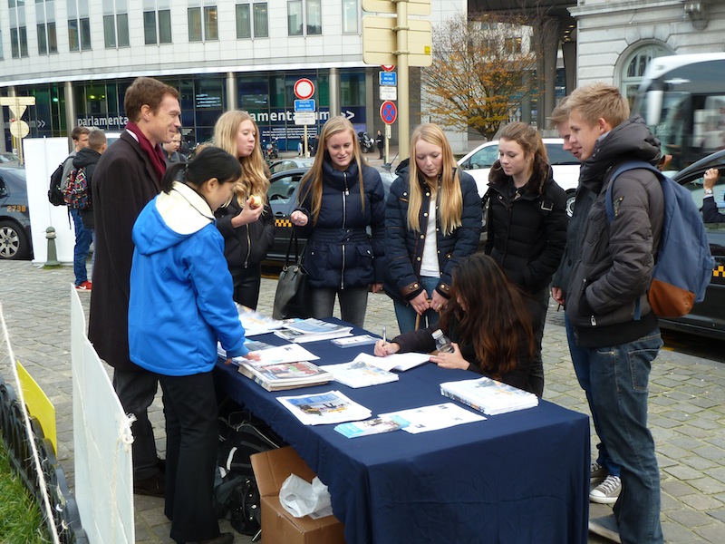 欧洲议会大楼外往来的路人,大多数人是到欧洲议会办事的欧洲各国人士。民众看了真相展板主动向学员了解真相,并在要求欧洲议会谴责制止“中共活摘器官”签名。