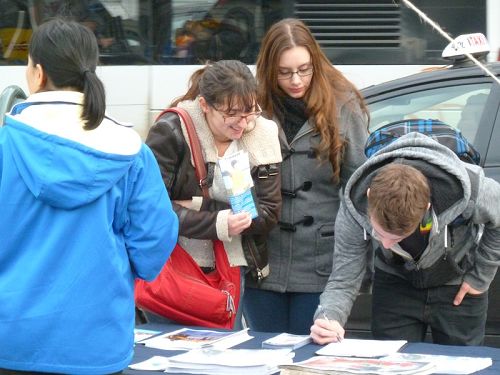 一些还不了解中共迫害法轮功情况的人,听说是法轮功的,主动上前索取资料。有的人当场读了起来,并且向学员做了详细的询问:什么是法轮功?中共为什么活摘法轮功学员的器官?为什么中国的众多民众不了解真相?为什么迫害了这么久?