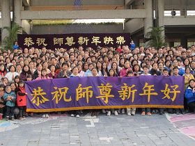 台湾中区五县和嘉义大法弟子恭祝师尊新年好 台湾中区大法弟子恭祝师尊新年快乐台湾中区五县市大法弟子经过三天二夜的集体学法交流后,全体学员向伟大的师尊拜年,“恭祝师尊新年快乐”。