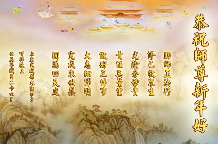 在新的一年里,弟子一定要时时处处实修,抓住一切机会救人,做好三件事,让师尊少为弟子操心,您太辛苦了,跪拜,师尊过年好。