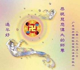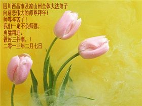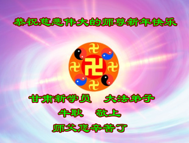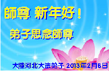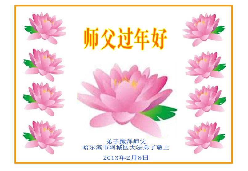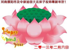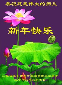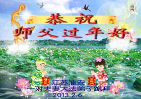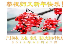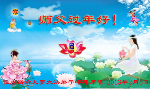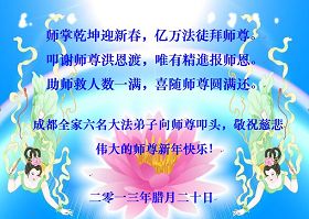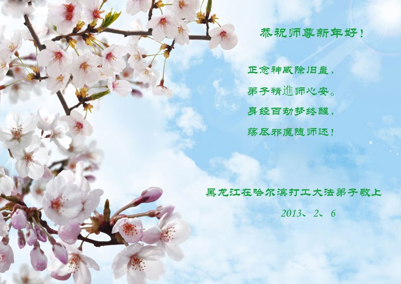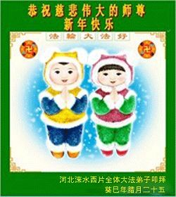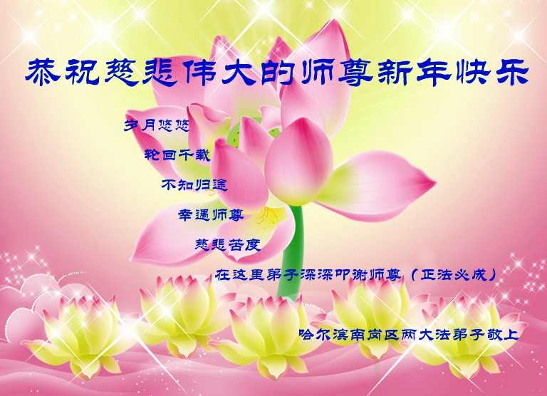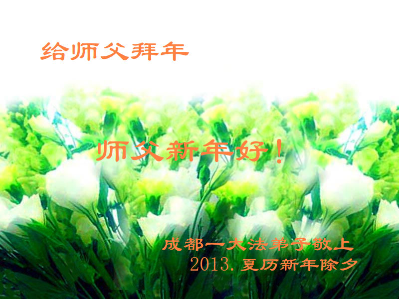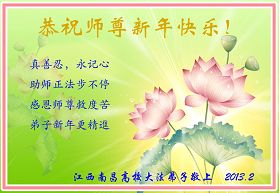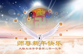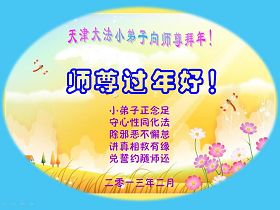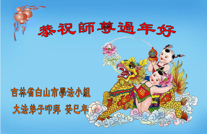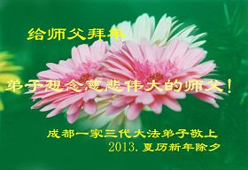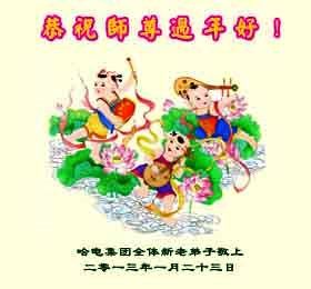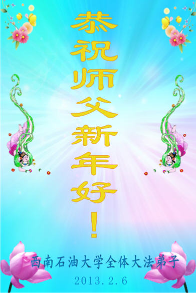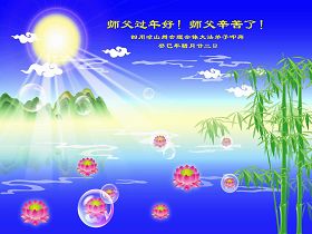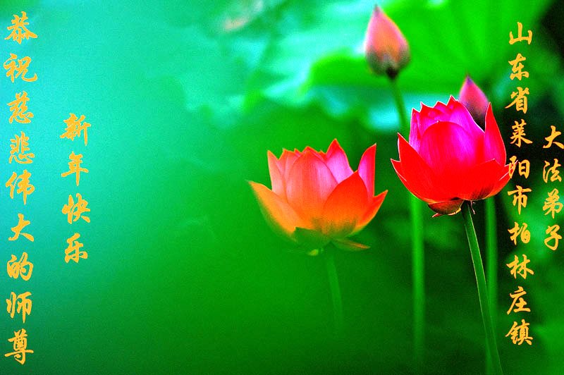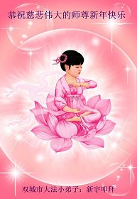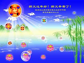 我是在大法中受益的,是李洪志师父给了我第二次生命,我非常感谢大法师父的洪恩浩荡,我会尽我的所能,告诉世人大法的美好,在此新春佳节之际祝李 老师新春快乐!!