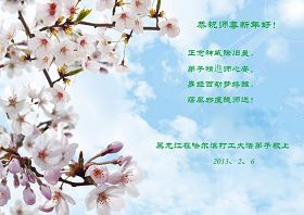 为此,在中华民族的古老新春即将来临之际,作为海外居住在北欧芬兰的一名华人,我向法轮功学员致以衷心的祝福,并对你们为自己的理想抱负而付出和传播寄予最佳赞赏;我希望法轮功朋友的事业如奇葩开放,在绝大多数人的心灵里香艳夺目,最后到达天下太平,没有战争和灾难的极乐世界。