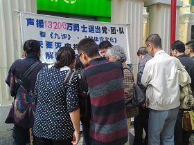 有一天下午,一个中年高个子的北方男子,走到学员面前,竖起大拇指,大声说:“真了不起,法轮功被打压现在,大陆都没有人讲了,十多年了你们还在这里坚持。”法轮功学员就跟他说:“法轮功被打压这事没有结束,仍有几十万学员被关押,不断有人被抓捕,而且中共迫害的手段更邪恶,只是为了掩盖迫害,邪*党-没有再宣传。”他说:“哦,原来是这样啊,坚持下去,法轮功一定胜利。”学员劝他三:退.,他说:“我连少先队也没有加入过。”于是学员说:“那就记住‘法轮大法好’。”他说:“是,‘法轮大法好’!”并多声道谢。