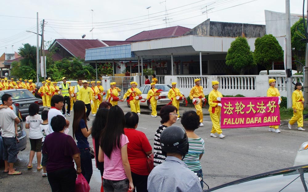 大年初四,法轮功学员来到柔佛州第二大城市,峇株巴辖(Batu Pahat)举行新年游行。灯笼队、舞龙队、仙女队再加上腰鼓队,色彩缤纷亮丽、充满喜气洋洋,弘扬着传统文化的队伍,吸引了当地许多民众出来观赏,大家为之赞叹。