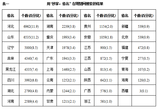 2013年2月13日,笔者用“抄家”、省名在明慧网搜索,得到了表一的结果。有读者会说,可能有的一个事件网上记录可能不止一次。是这样的,但在相同的条件下,因为是比较数据,影响会小一些。有些误差,但总体还是会反映出事物、事件的特点来。这里说明一下,由于北京的特殊性,如1999年7.20后,全国各地法轮功学员都去北京上访护法,回去后有些学员被邪*党-人员(抢劫)抄家,如果这样搜索,数据失真性大。同样,西藏数据量太小,失真性也大。所以这两个地方数据用“抄家,地名法轮功学员”和“抄家,地名大法弟子”来搜索综合得到。