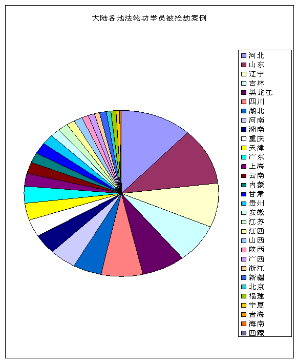 从表一和上图我们可以知道,邪*党-人员抢劫法轮功学员最严重的地区,首先是河北、山东、辽宁、吉林、黑龙江、四川,其次是湖北、河南、湖南、重庆、天津、广东……,遍及了中国大陆所有的省、直辖市、自治区。