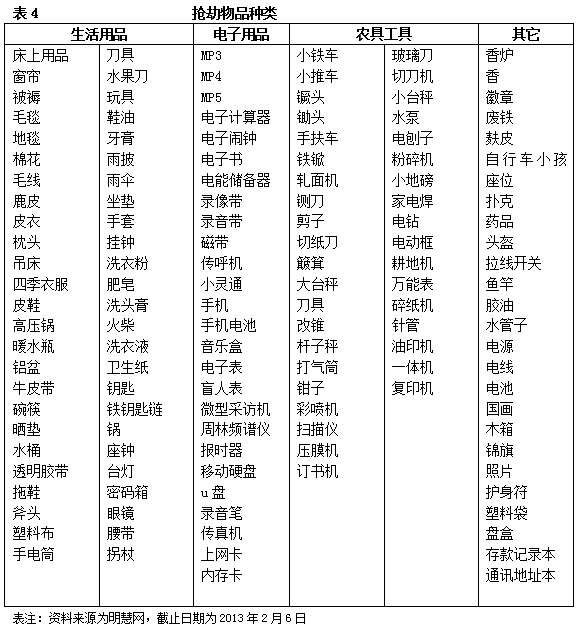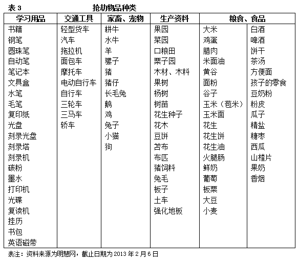 被抢劫物品,几乎都是中共人员入室抢劫,共350种。本文将其分为十三类:⑴家具、房屋设施,⑵家电,⑶现金、贵重物品,⑷证件、票据,⑸学习用品,⑹交通工具,⑺家畜、宠物,⑻生产资料,⑼粮食、食品,⑽生活用品,⑾电子用品,⑿农具工具,⒀其它。见表2、表3、表4。