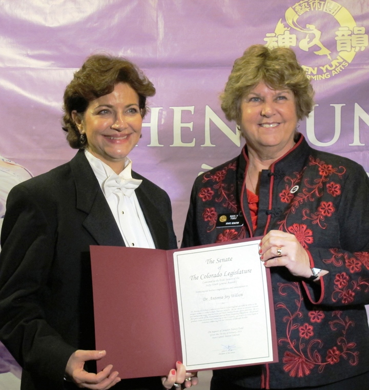 科罗拉多州参议员南西•托德(右)向神韵乐团指挥安东尼娅•乔伊•威尔逊颁发褒奖