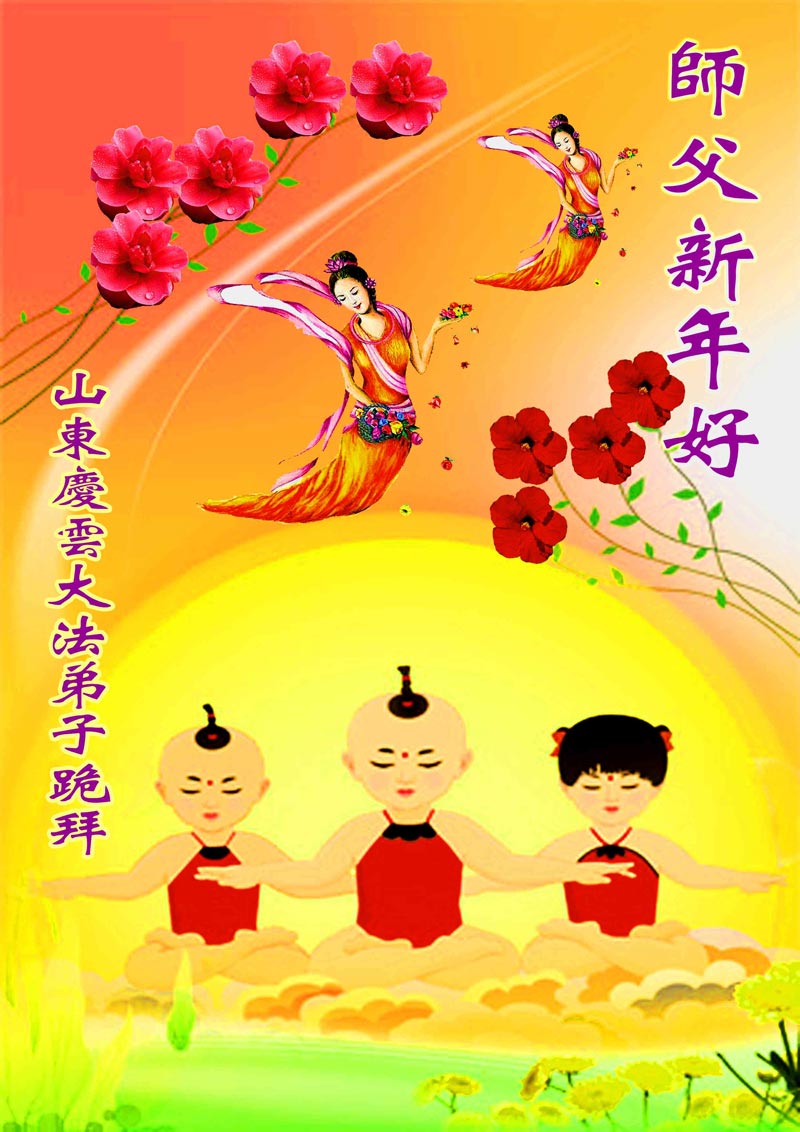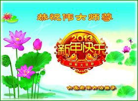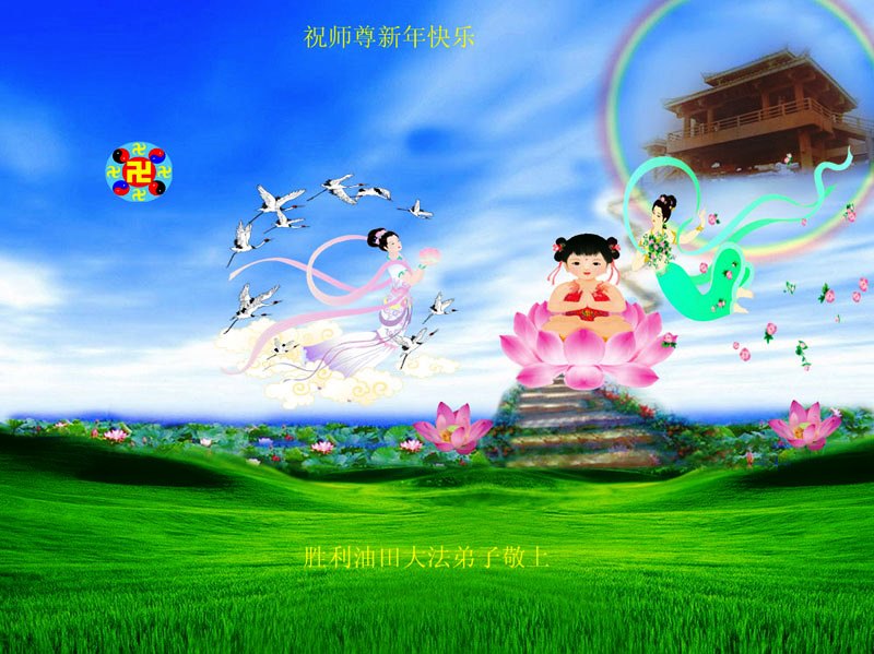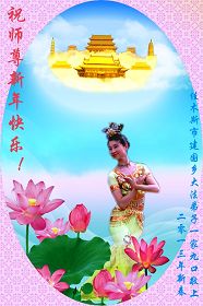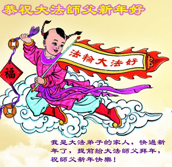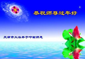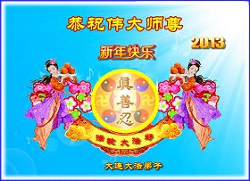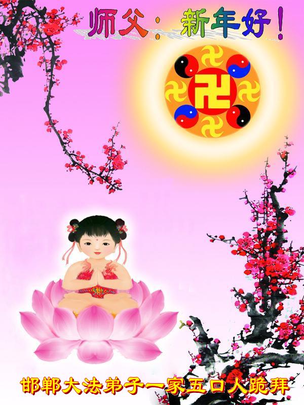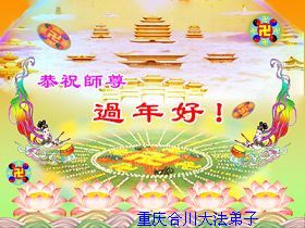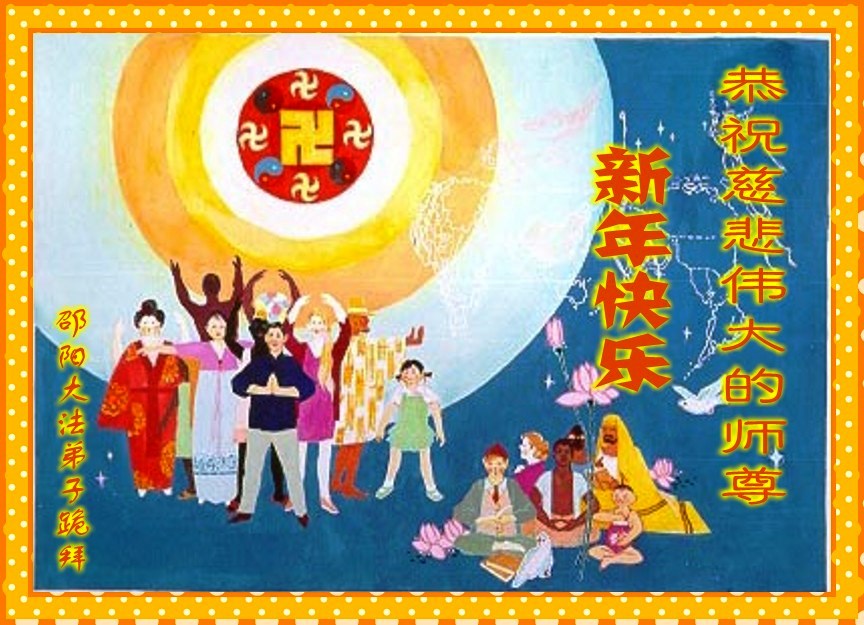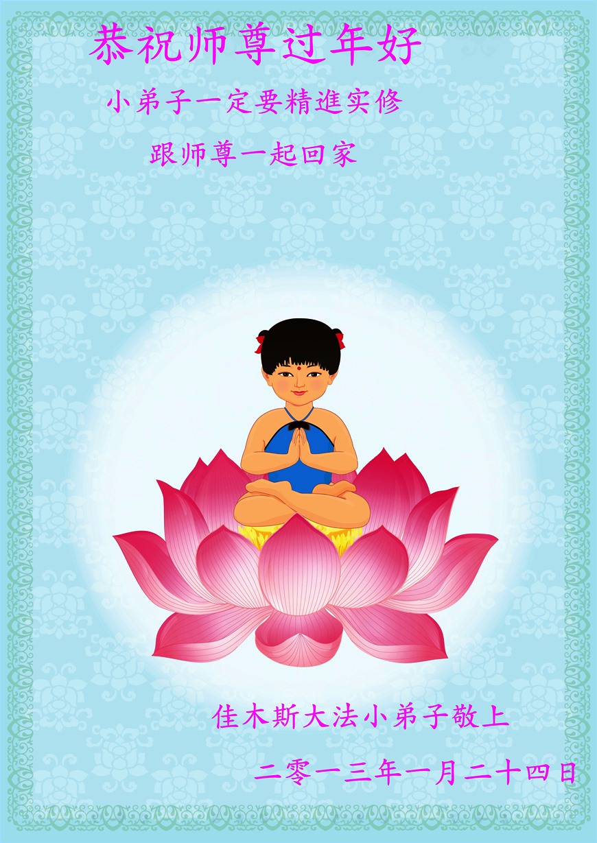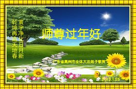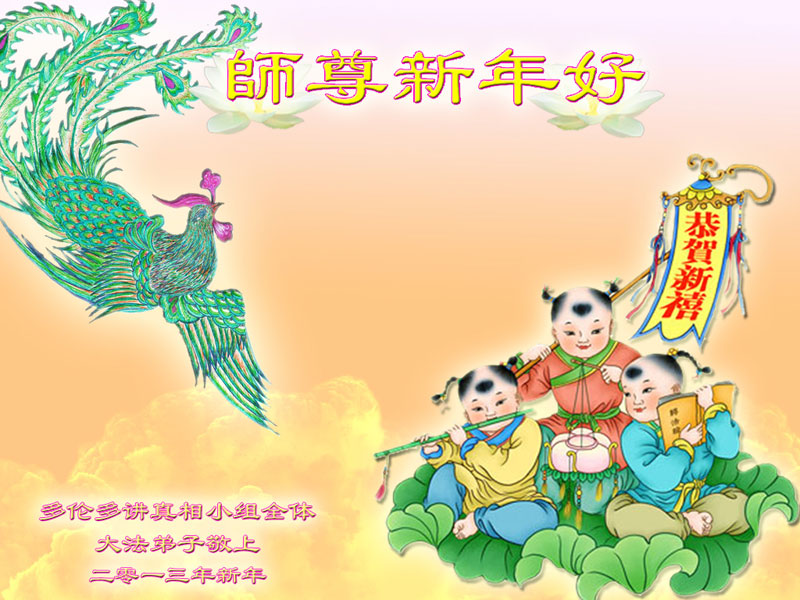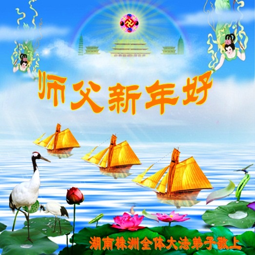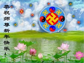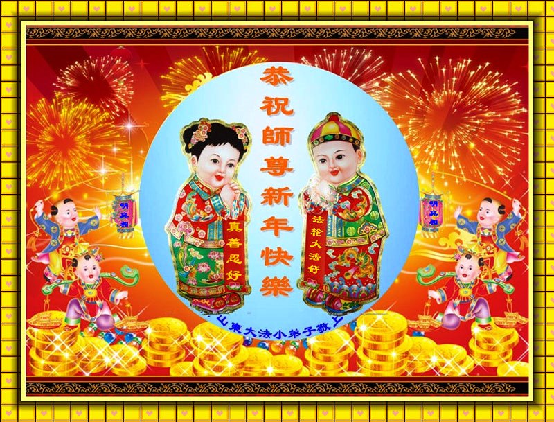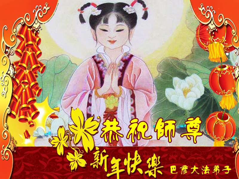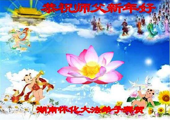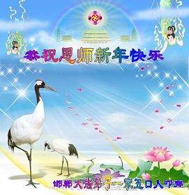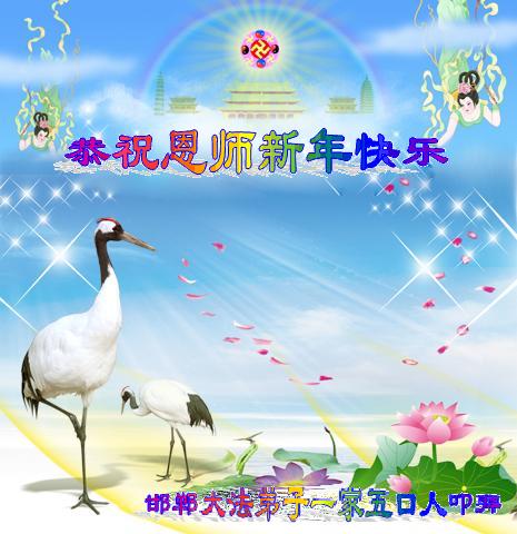 您为拯救众生、为您的弟子们修炼提高护航实在太辛苦了,您为人类带来了无限的光明和希望。看到您的弟子在中共高压迫害的14年里,他们一如既往,年复一年日复一日的做着讲清真相救人的大事,而且不求回报,无私付出,只有您这高德师父才会教出如此善良无私的徒弟。为表敬意,借新年佳节之际发个贺卡,祝您新年愉快,合家欢乐。