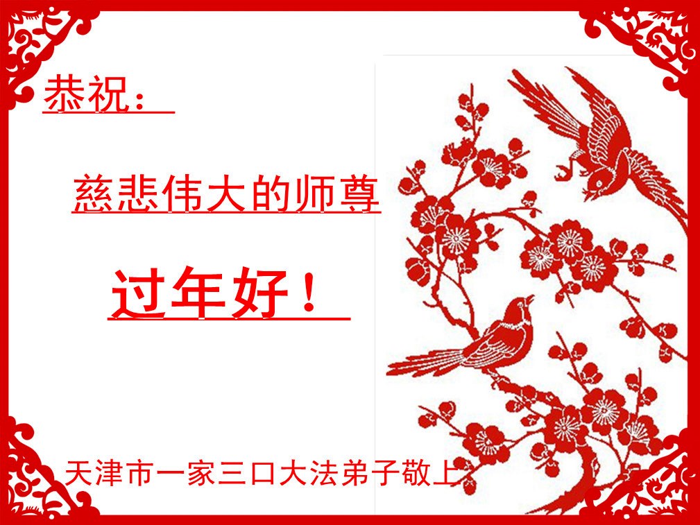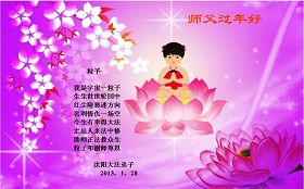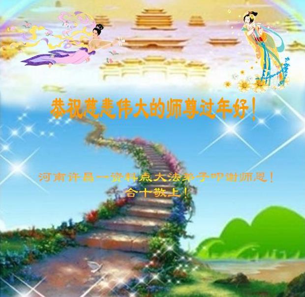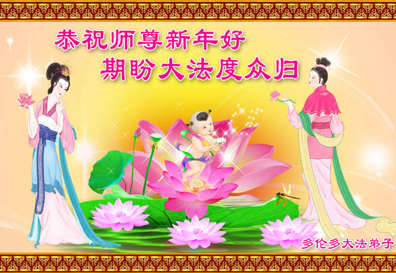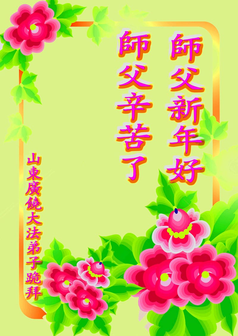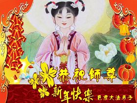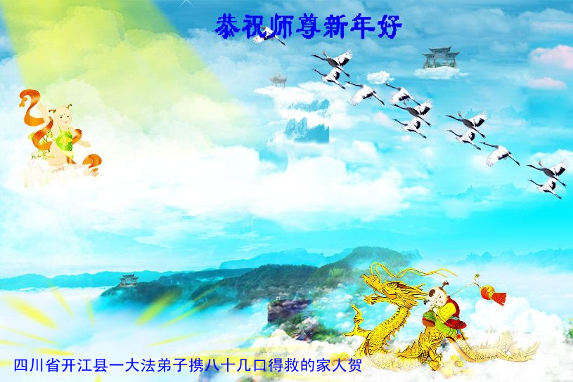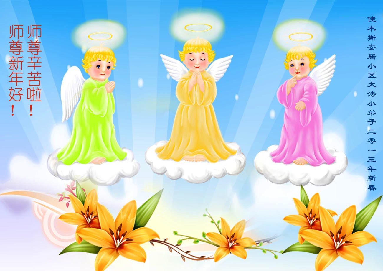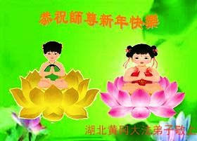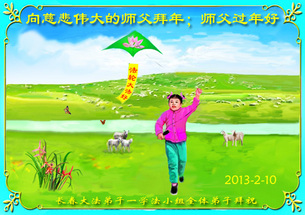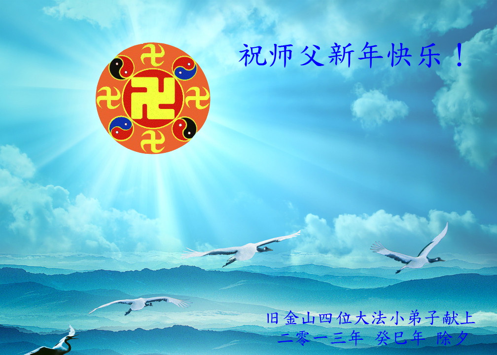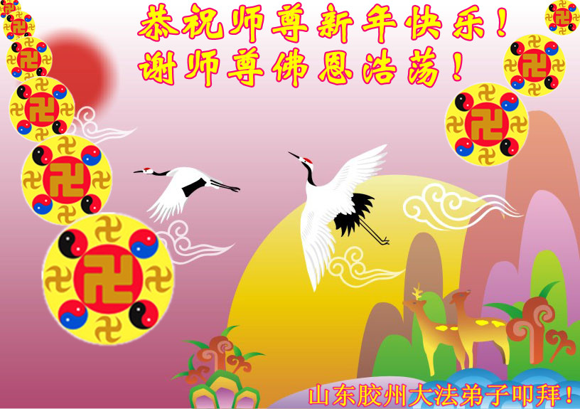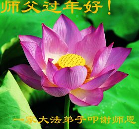 您为拯救众生、为您的弟子们修炼提高护航实在太辛苦了,您为人类带来了无限的光明和希望。看到您的弟子在中共高压迫害的14年里,他们一如既往,年复一年日复一日的做着讲清真相救人的大事,而且不求回报,无私付出,只有您这高德师父才会教出如此善良无私的徒弟。为表敬意,借新年佳节之际发个贺卡,祝您新年愉快,合家欢乐。